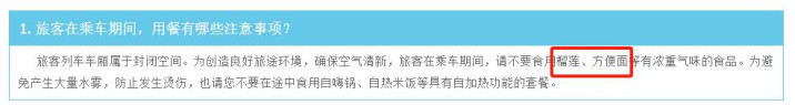 近日,有网友发帖称,高铁车厢对方便面的食用有相关提醒,“旅客在乘车期间,请不要食用榴莲、方便面等有浓重气味的食品。”